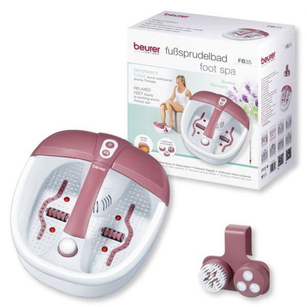 Массажная ванночка для ног Beurer FB35 White (637.05) доставит вам немало приятных минут и расслабит мышцы после долгой ходьбы, избавит от «гудения» стоп и ломоты, снизит отёчность. А дополнительные насадки ещё и помогут обработать огрубевшую кожу и натоптыши. Помимо пузырькового гидромассажа, устройство работает в режиме вибрации и инфракрасного прогрева. Температура поддерживается в течение нужного вам времени, теплоизоляцию улучшают двойные стенки. Прибор оснащён 18 магнитами, подобная терапия способствует снятию воспалений, обладает стимулирующим и общеукрепляющим действием. Специальный отсек для эфирных масел позволит дополнить процедуру приятными ароматами. В комплект входят щётка, насадки для точечного массажа и для удаления сухих мозолей. Для их компактного и удобного хранения есть вешалка, которую можно прикрепить к бортику. Beurer FB35 снабжена защитной крышкой, которая не позволит брызгам воды намочить пол. Прорезиненные ножки отвечают за устойчивость и не дают ванночке скользить.