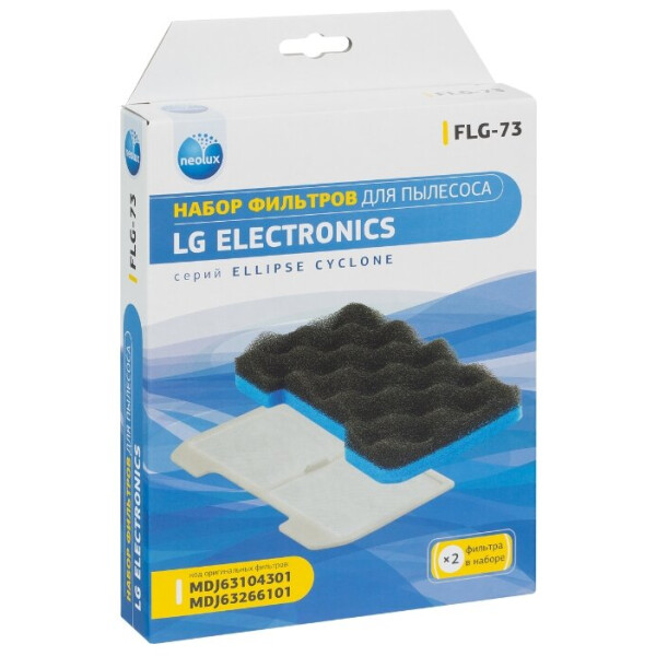 Набор моторных фильтров Neolux FLG-73 предназначен для пылесосов LG серий: Ellipse Cyclone VK731.., VK73W.., VC401... Код оригинального поролонового фильтра MDJ63104301, код оригинального сетчатого фильтра MDJ63266101.