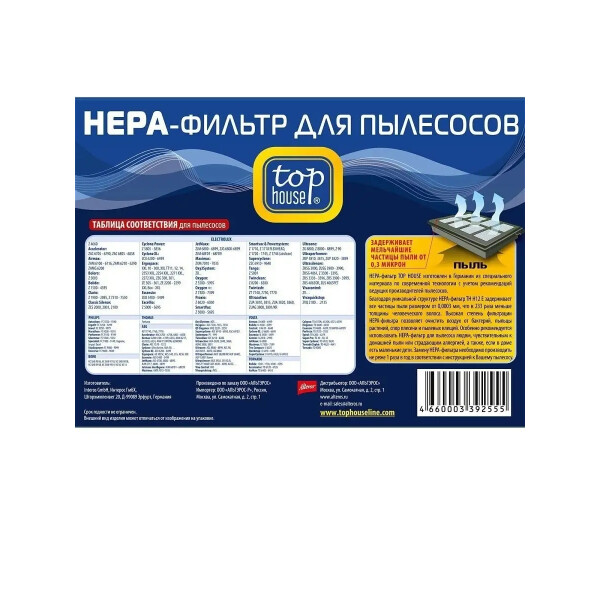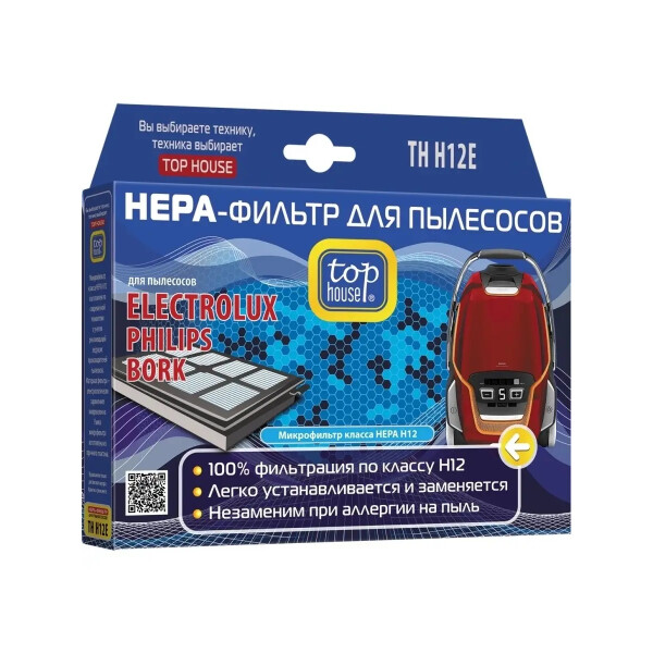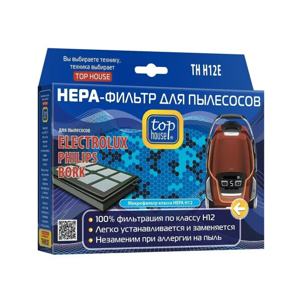 TOP HOUSE TH H12E HEPA-Фильтр для пылесосов ELECTROLUX, PHILIPS, BORK Высокая степень фильтрации HEPA-фильтра позволяет очистить воздух от бактерий, пыльцы растений, спор плесени и пылевых клещей