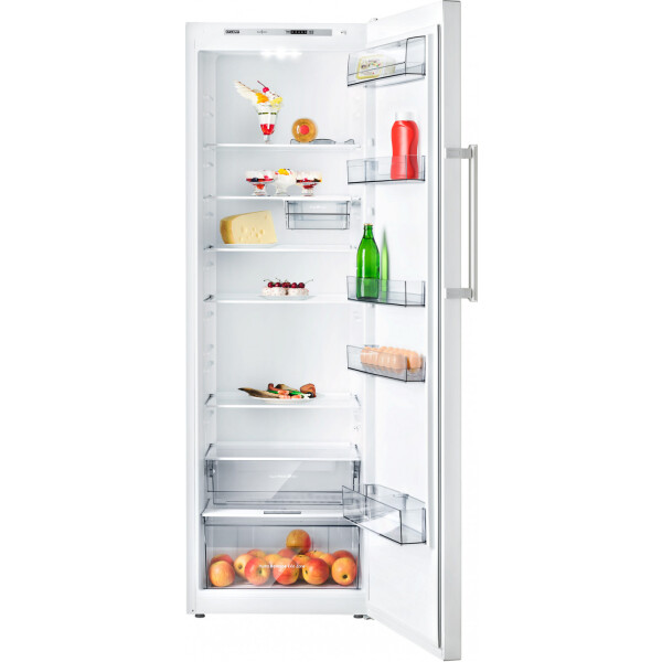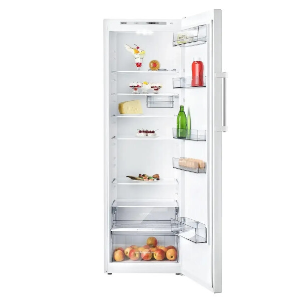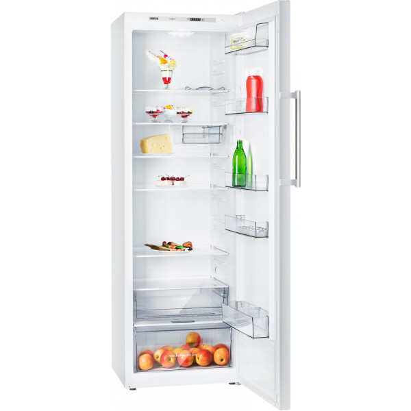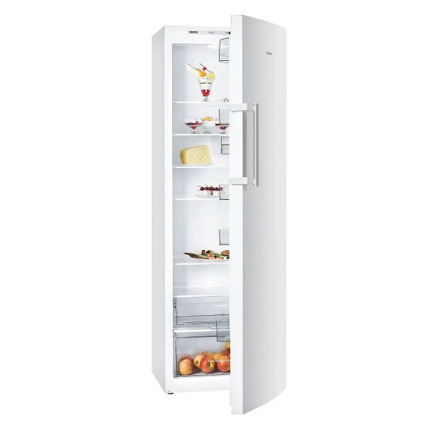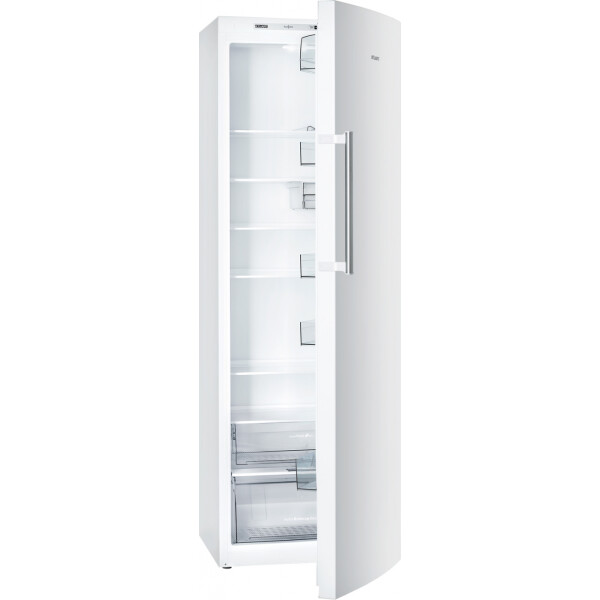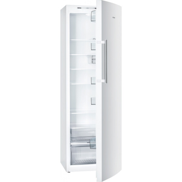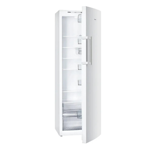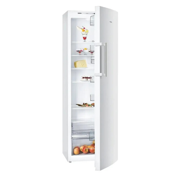 Холодильник выполнен в белом цветовом исполнении с наружной вертикальной ручкой-скобой серебристого цвета, которая подчеркивает эксклюзивный дизайн модели. В камере расположено 5 полок из закаленного стекла. На двери холодильника установлено 5 емкостей из ударопрочного пластика, в том числе емкость нижняя с ограничителем для бутылок и емкость верхняя с крышкой.