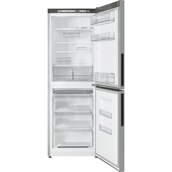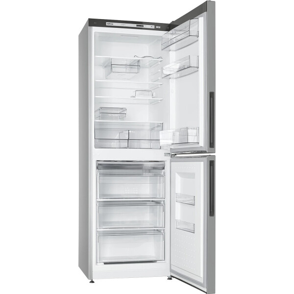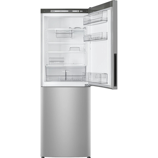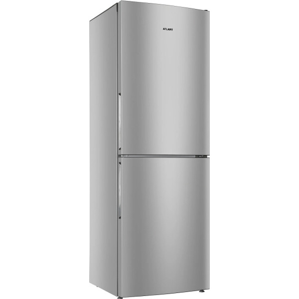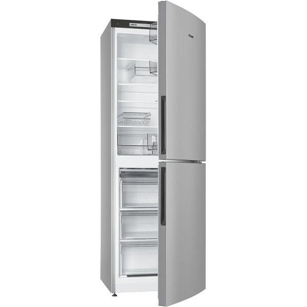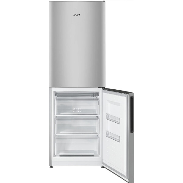 Холодильник ATLANT - двухкамерная модель. Общий объем составляет 301 л. Уровень шума не превышает 39 дБ. Дверцы перенавешиваемые, сделаны из металла и покрыты эмалью серебристого цвета. В набор включены подставка для яиц и масленка. Холодильное отделение оснащено капельной системой разморозки. Внутри расположены три стеклянные полки, отсек для фруктов и овощей. Удобство эксплуатации обеспечивают светодиодное освещение и электронный дисплей. Устройство соответствует классу энергоэффективности А+.
