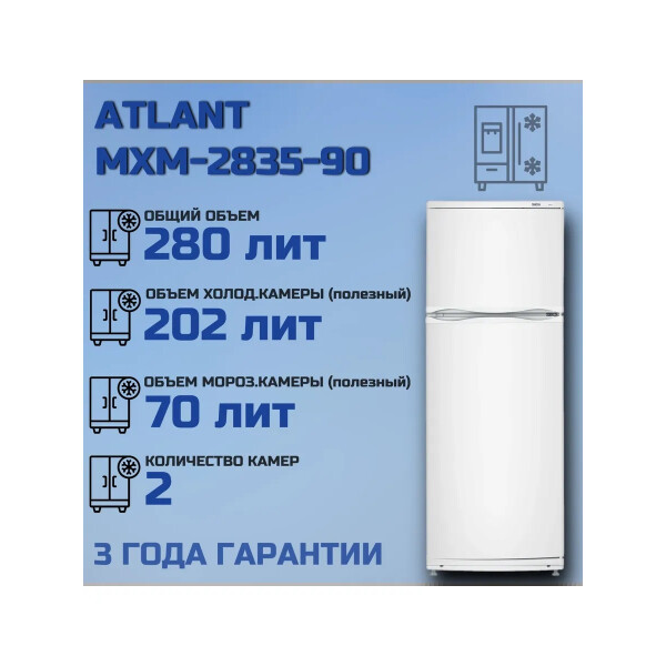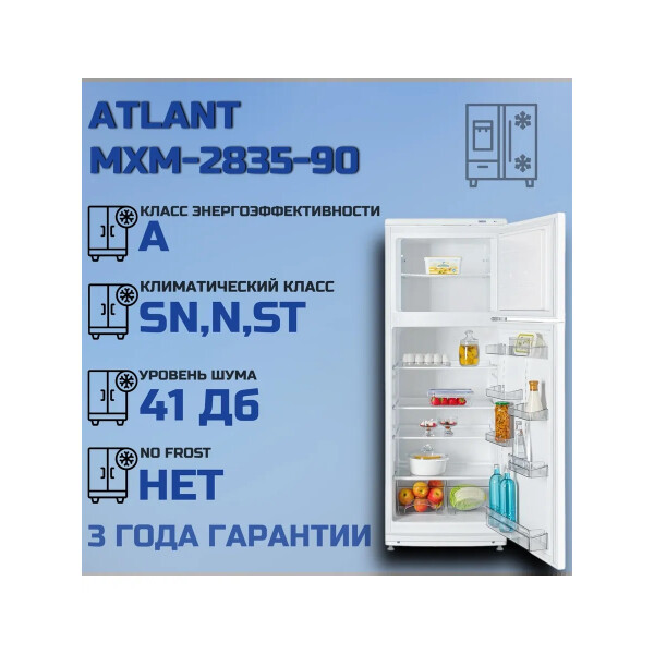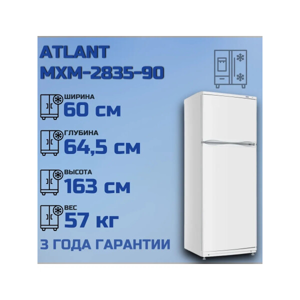 Холодильник с морозильником ATLANT МХМ 2835-90 оснащен морозилкой с верхним расположением. Скорость заморозки продуктов не менее 4.5 кг в сутки. Объем данного отсека равен 70 литрам, он равномерно разделен на 2 части с помощью решетчатой полочки. Минимальная температура в морозилке составляет 18 градусов. В случае отключения модели от сети холод удерживается на протяжении суток.