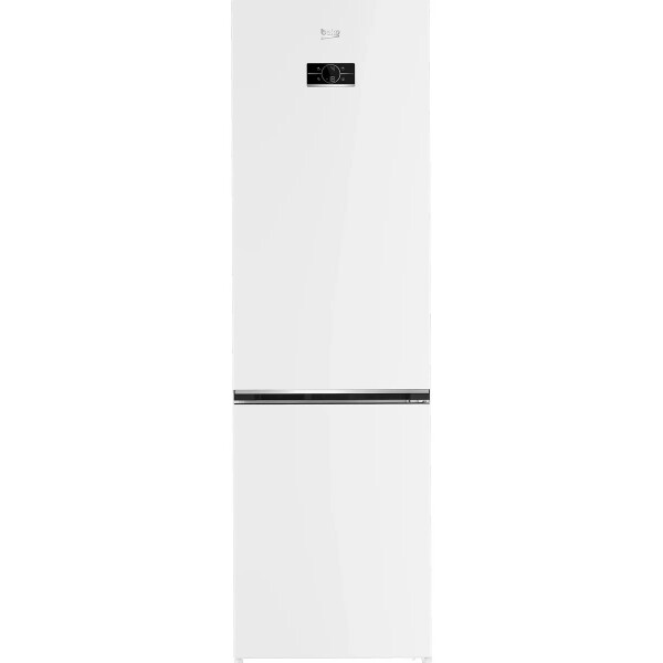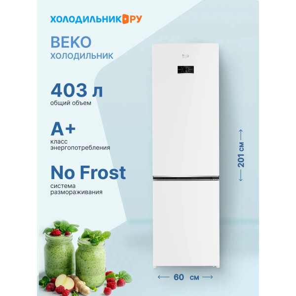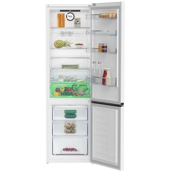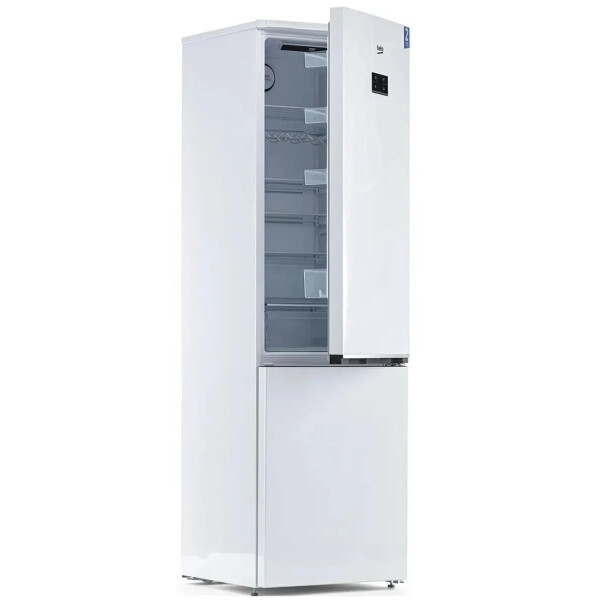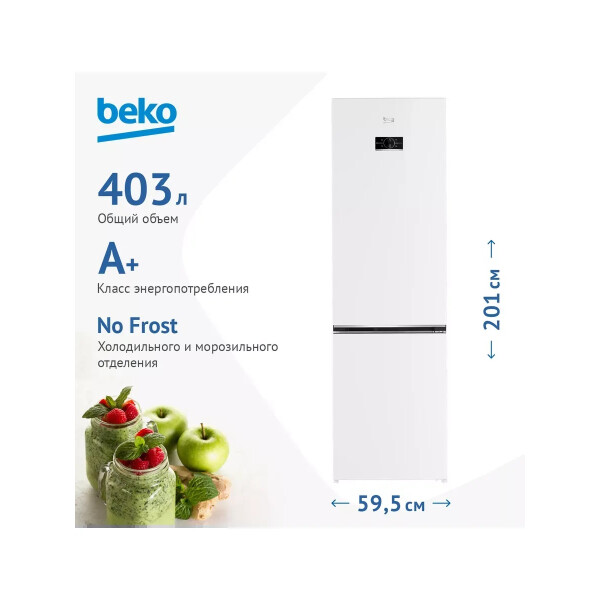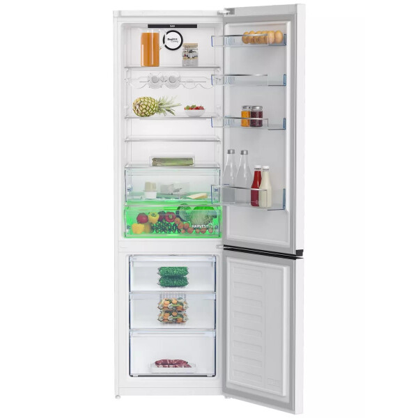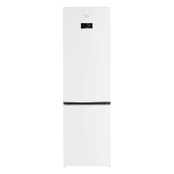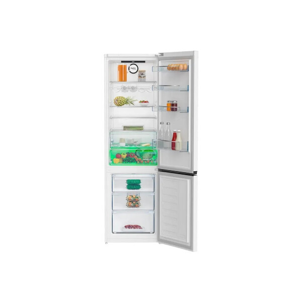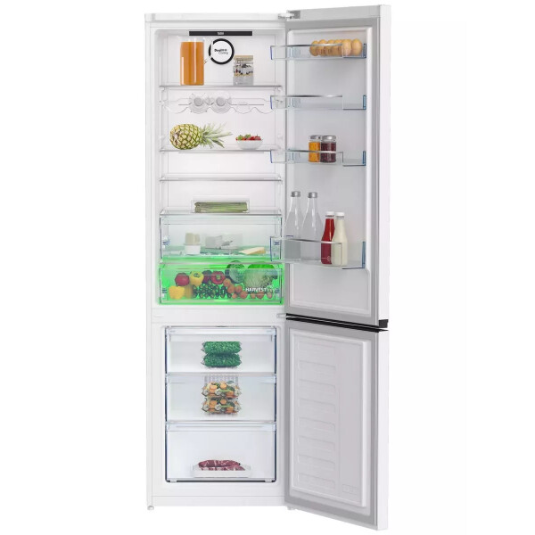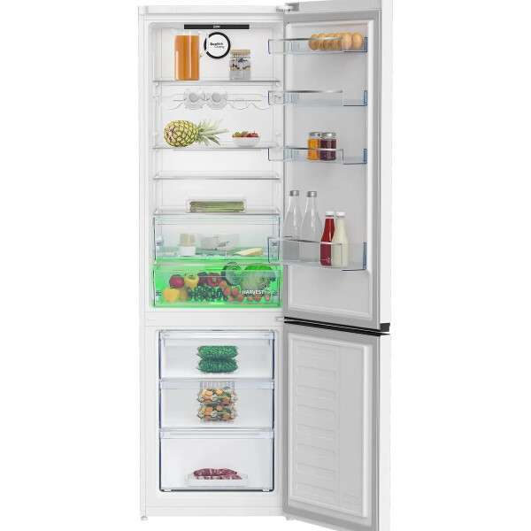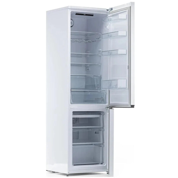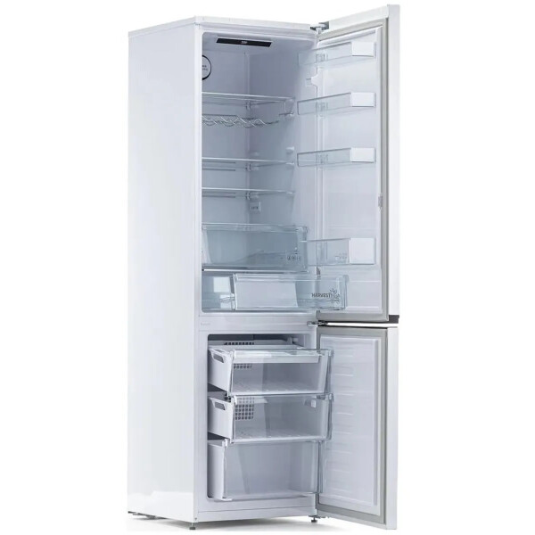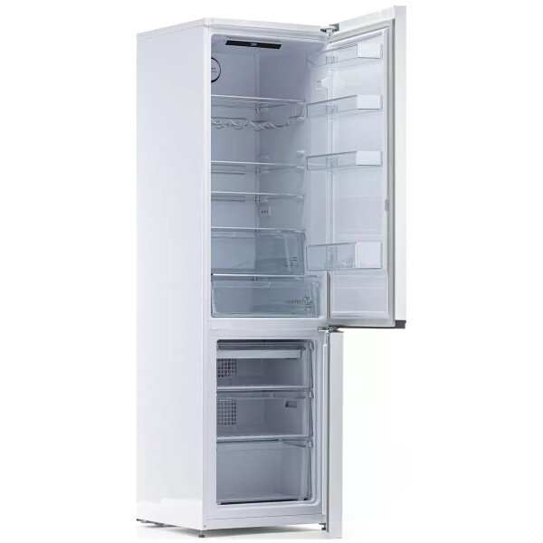 Белый двухкамерный холодильник имеет высоту 2 метра, удобный цифровой дисплей, электронное управление и энергосберегающий режим Отпуск. Холодильник оснащен двухконтурной системой охлаждения NoFrost Dual Cooling (Ноу Фрост), которая разделяет воздушные потоки между холодильной и морозильной камерами для лучшего охлаждения без смешивания запахов и образования льда на стенках. В холодильной камере расположены отделение для свежих фруктов и овощей с технологией трехцветной подсветки HarvestFresh и специальный отсек с температурой 0-3 С для более долгого хранения свежего мяса, рыбы и молочных продуктов.