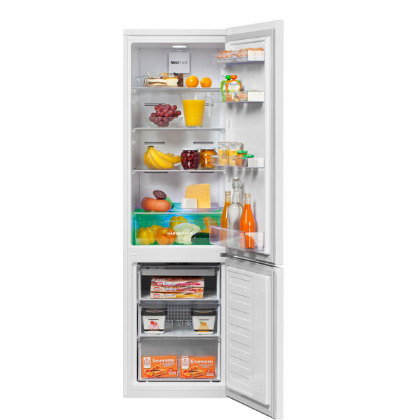 Белый двухкамерный холодильник с нижней морозильной камерой имеет общий объем 310 л и оснащен двухконтурной системой охлаждения NoFrost Dual Cooling (Ноу Фрост), которая предотвращает смешивание запахов и образование льда на стенках, поэтому холодильник не нужно регулярно размораживать. Камера быстрой заморозки в холодильнике позволяет добавлять продукты комнатной температуры в морозилку, не нарушая температурный режим внутри. Холодильник имеет энергосберегающий режим работы Отпуск, при котором подача холодного воздуха в холодильную камеру отключается, за счет чего снижается потребление электричества, если вы надолго уезжаете из дома и освобождаете холодильник от продуктов.
