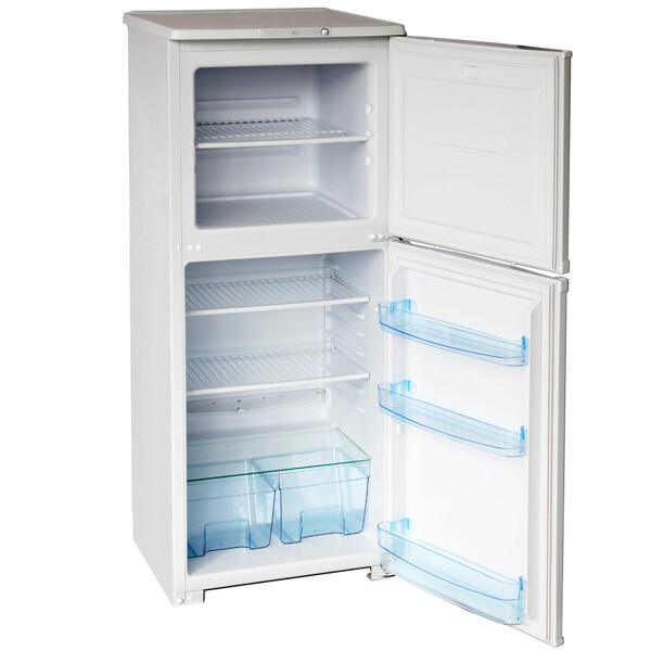 Несмотря на небольшую высоту в 145 см, двухдверный холодильник Бирюса 153 является полноразмерным аппаратом. Он имеет две разных секции: отдельную вместительную морозильную камеру объемом 70 литров и основную холодильную камеру объемом 160 литров. В верхнем морозильном отделении есть две удобные полки, а уровень минимальной температуры может опускаться до -18 °С.
