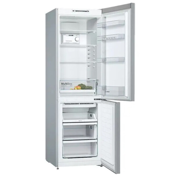 Холодильник Bosch представлен в стильном серебристом корпусе. Его вместительность достигает 329 л: этот объем распределяется между двумя камерами.