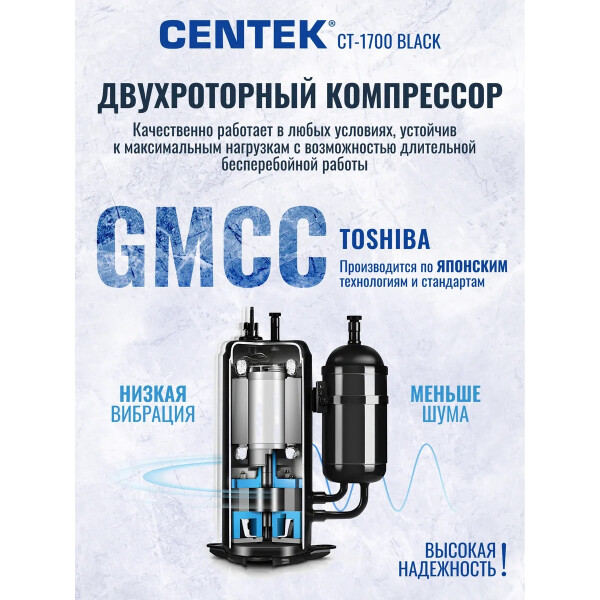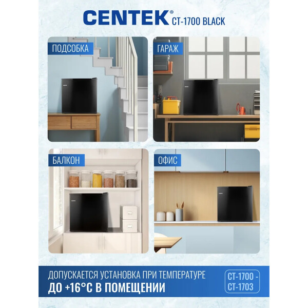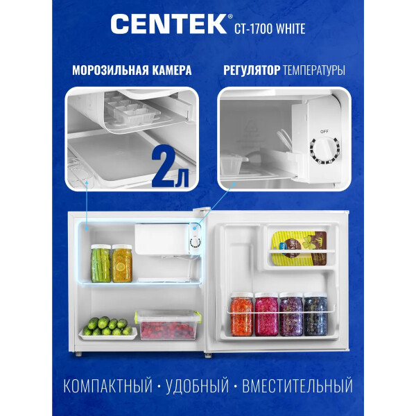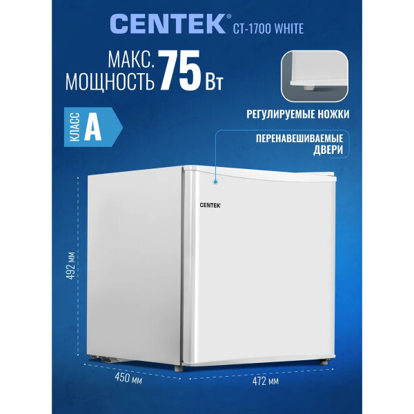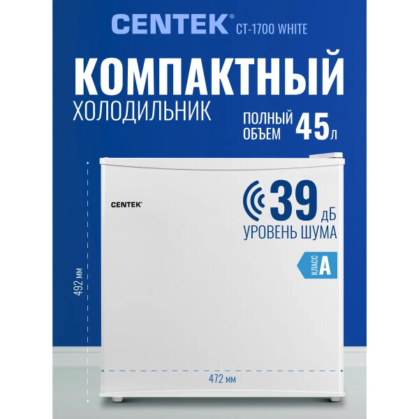 Холодильник Centek CT-1700 выполнен из экологически чистых материалов. Низкий уровень шума: 42 дБ. Полезный объём холодильной камеры: 43 литра. Класс энергопотребления А+.