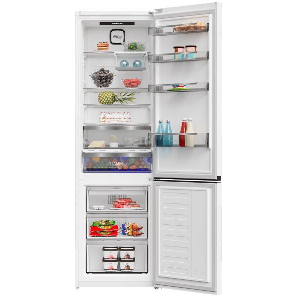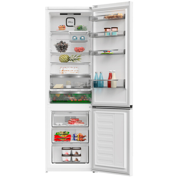 Холодильник Grundig GKPN66930FW из серии Prologue оснащен инверторным компрессором. Объем основной камеры 257 л, морозильника 100 л. В обоих отделениях реализована технология автоматического размораживания No Frost. Для хранения продуктов предусмотрены полки из закаленного стекла и выдвижные ящики из пластика. Есть сухая зона сохранения свежести VitaminZone с ящиком, который движется с помощью телескопических направляющих. Система управления электронная. Есть режимы Отпуск и Суперзамораживание и функция энегосбережения, доступно LED-освещение. Безопасность обеспечивают защита от детей и звуковая и световая сигнализация открытой двери.