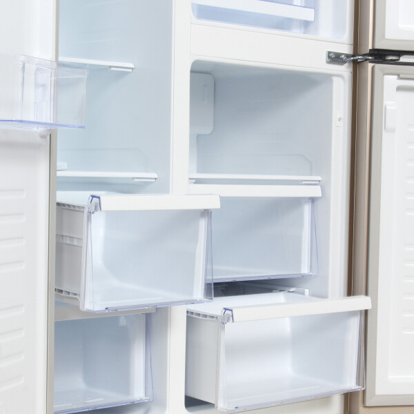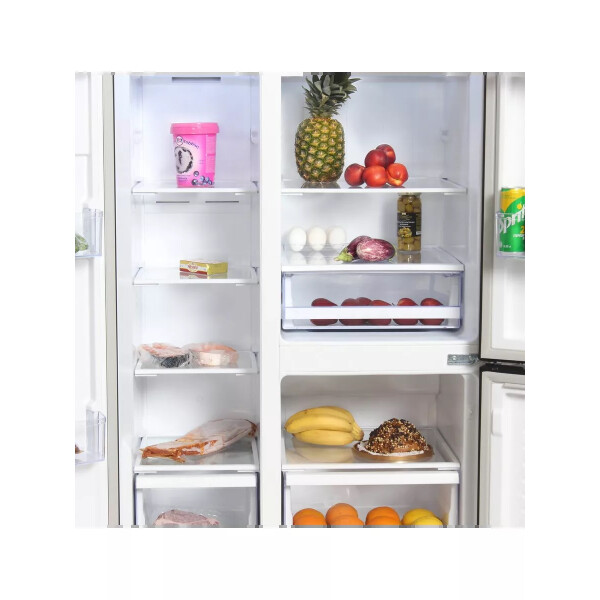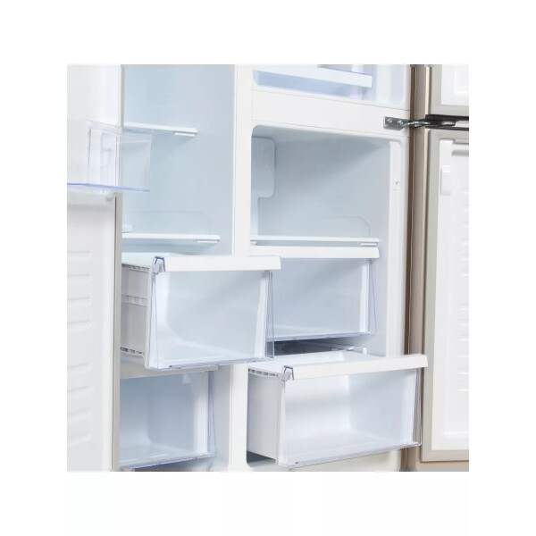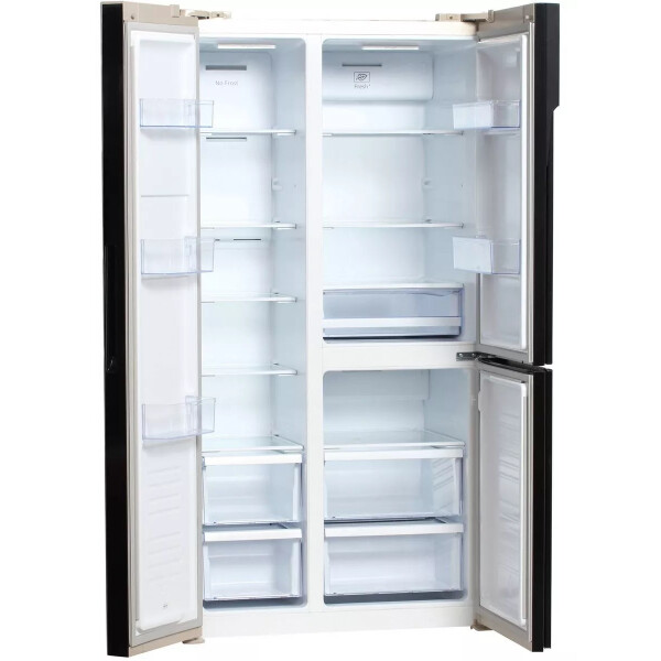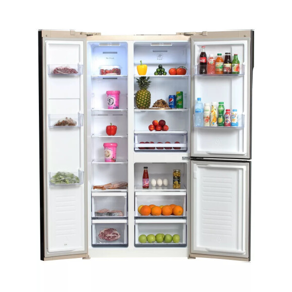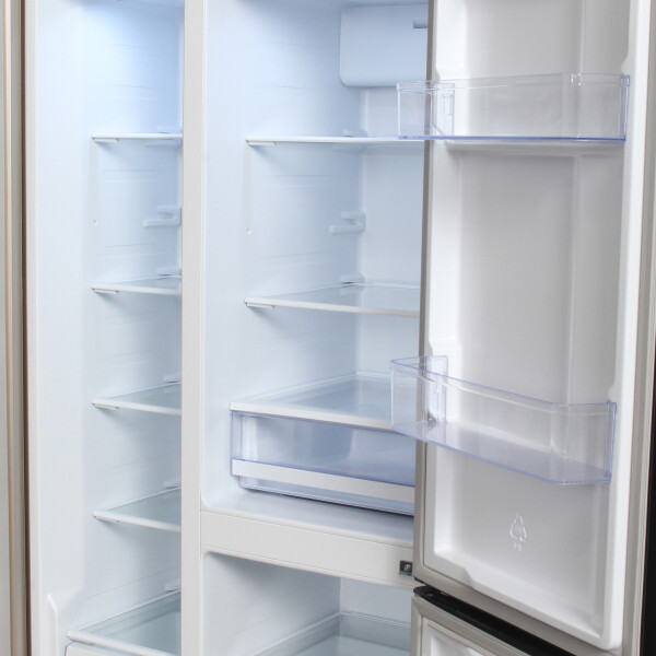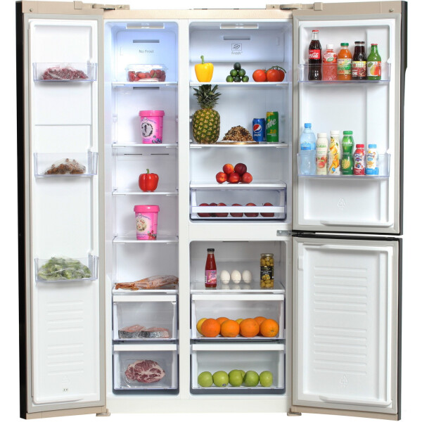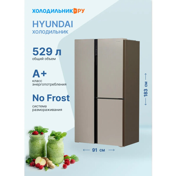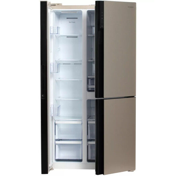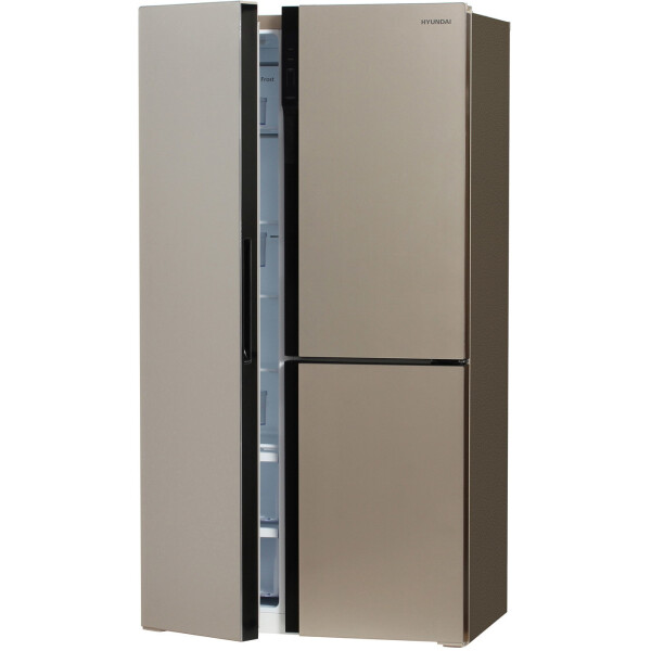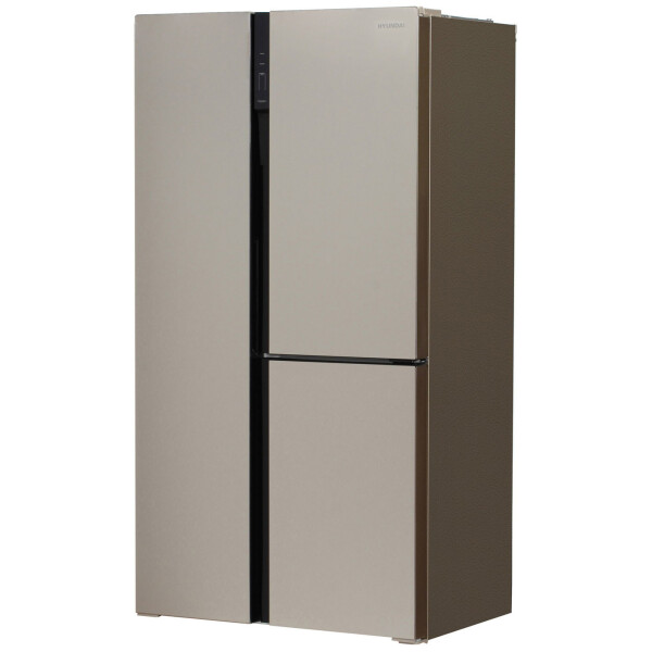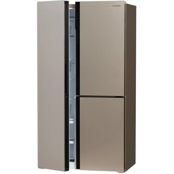Ценителям оригинальных вещей очень понравится 3-х дверный инверторный холодильник HYUNDAI CS5073FV (тип Side by Side) со стеклянными дверцами, выполненными в цвете Шампань.