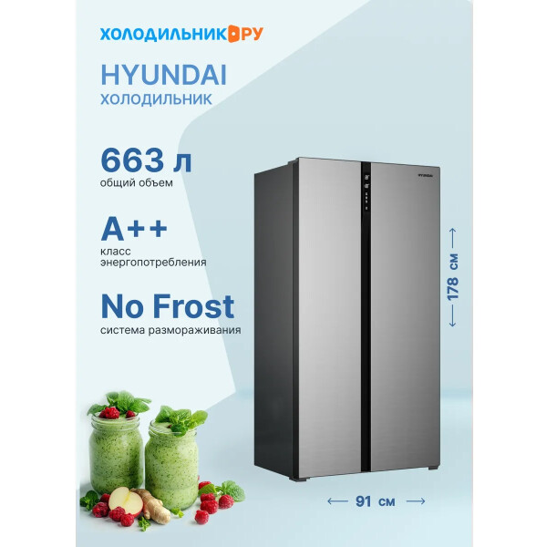 Ультранадежный инверторный компрессор работает бесшумно, при этом потребляя мало энергии - модели HYUNDAI CS6503FV присвоен класс энергопотребления А++. Благодаря внешнему дисплею можно легко и быстро менять температурный режим, запускать систему суперохлаждения. Что касается разморозки, удаления наледи, то об этом заботится технология No Frost, которая упрощает использование холодильника и избавляет от необходимости проводить частые профилактические работы.
