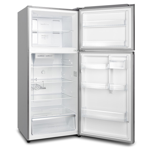 Работает достаточно тихо: уровень шума при работе не достигает 45 дБ. Холодильная камера укомплектована 4 полками из закаленного стекла и 1 ящиком для овощей и фруктов, морозильник 1 ящиком. В обеих камерах для размораживания применяется система No Frost. Контроль температуры обеспечивает индикатор, а устойчивость холодильника регулируемые ножки.