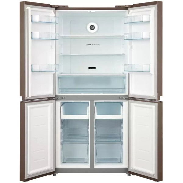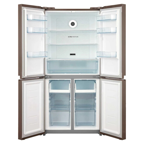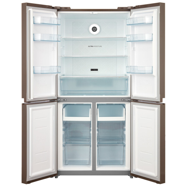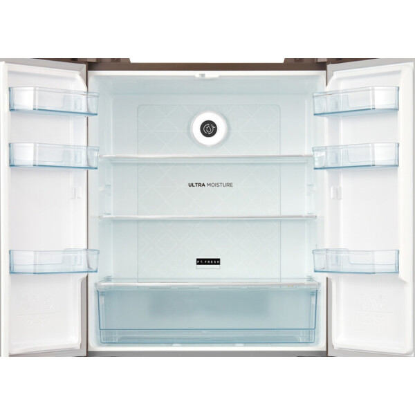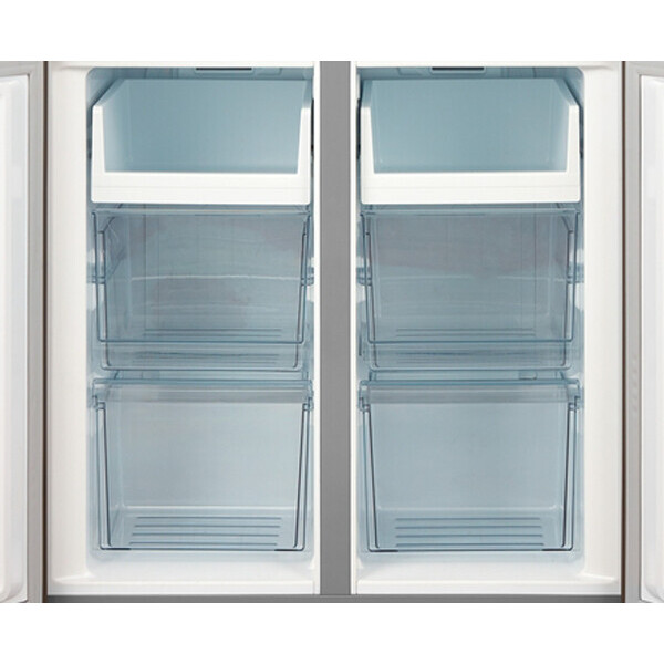 Благодаря увеличенному объему этот холодильник подойдет большой семье и тем, кто привык готовить много и разнообразно, делать заготовки на недели вперед. Дверные упоры сделаны по принципу Side-by-Side створки раскрываются от центра в обе стороны. При этом сами камеры расположены стандартно: холодильная сверху, морозильная снизу.