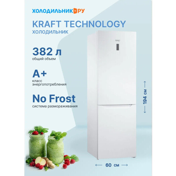 Холодильник KRAFT TNC-NF501W имеет общий объем 382 л. Полезный объем холодильной камеры составляет 245 л, а морозильной - 97. Скорость замораживания продуктов в морозильной камере достигает 10 кг в сутки. Модель относится к классу энергоэффективности А+. Дверцы можно перевесить так, как удобно пользователям.