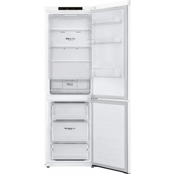 Холодильник LG выполнен в белом цвете, а его общий объем соответствует 374 л. Морозильная камера, расположенная внизу, обладает объемом 107 л и предусматривает разделение на три ящика с прозрачными стенками. На холодильное отделение отводится 234 л.