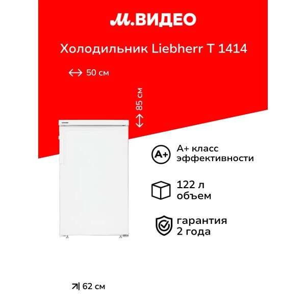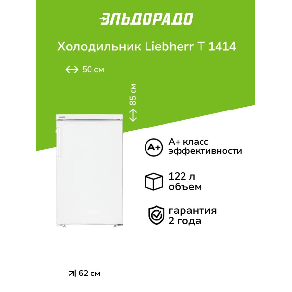 Холодильник Liebherr T 1414 белого цвета благодаря своей замечательной компактности станет достойным выбором для дачи или временного жилища. Имея полный объем камеры в 122 литра, он располагает встроенной морозильной камерой небольшого размера для заморозки самых основных продуктов. Холодильник отличается рекордно малым потреблением энергии и может до 10 часов сохранять внутри приемлемую температуру даже при отсутствии питания.