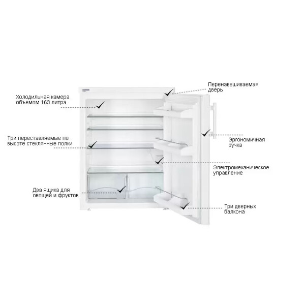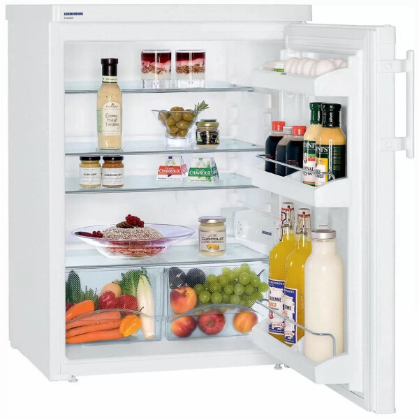 Миниатюрный холодильник Liebherr T 1810 белого цвета станет незаменимым помощником на даче или в загородном доме. Четыре стеклянные полки, два ящика для фруктов и вместительные боковые полки для консервных банок и стеклянных бутылок поместят все необходимое и ничего лишнего. Компактный размер (высота – 85 см, ширина – 60 см) позволят ему поместиться на самой миниатюрной кухне или сделать его элементом встроенного гарнитура.