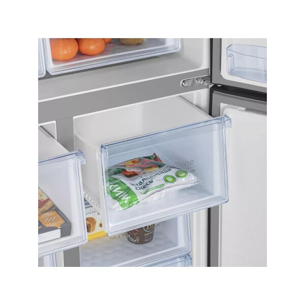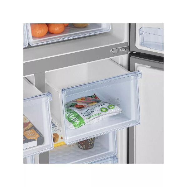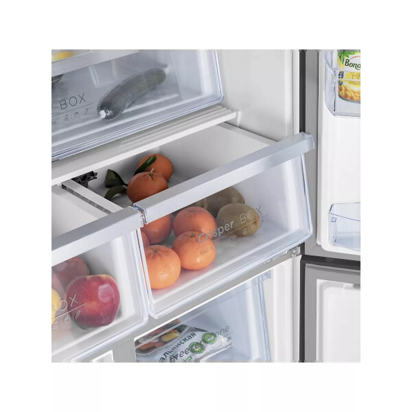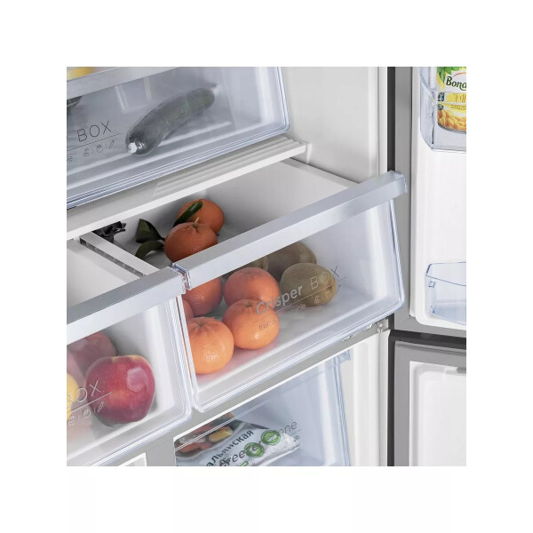 В трех независимых камерах есть полки из прочного закаленного стекла и ящики со стенками из прозрачного пластика. Вы легко распределите по ним продукты так, как вам удобно, а LED-освещение поможет быстро найти то, что вам нужно.