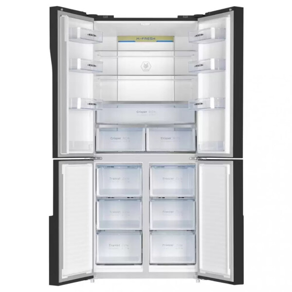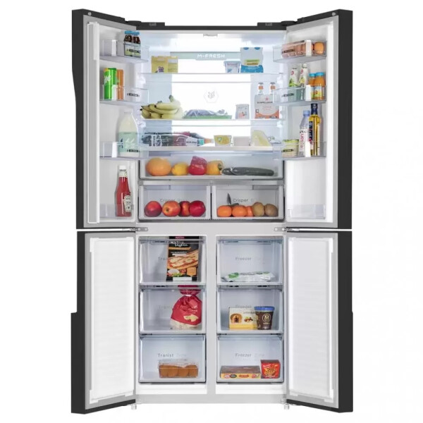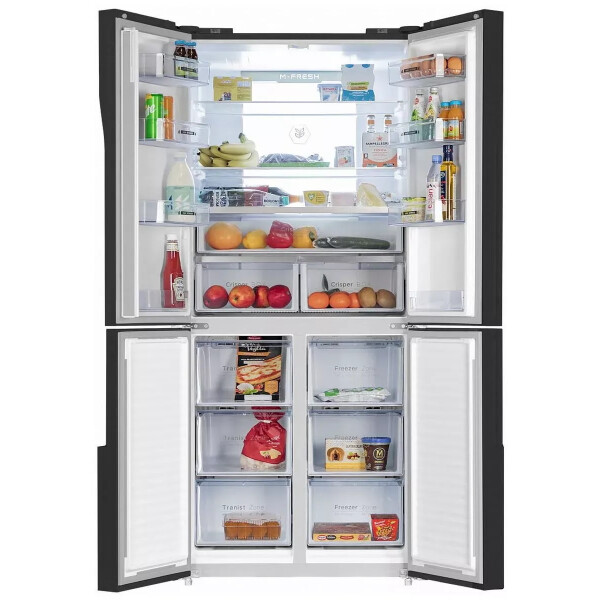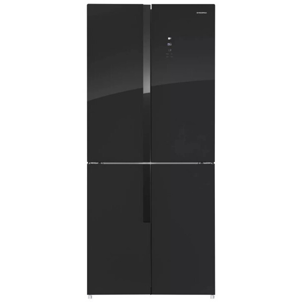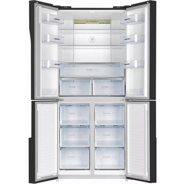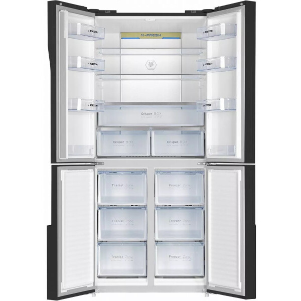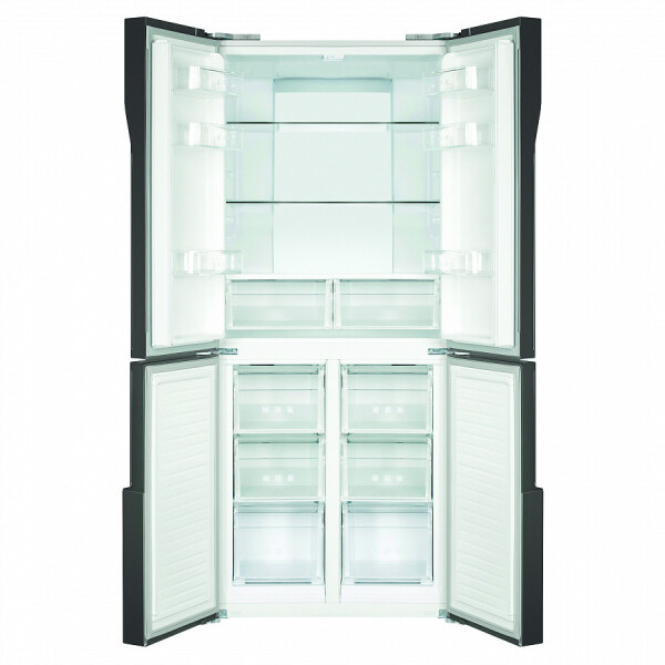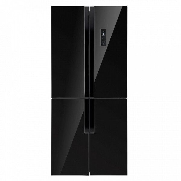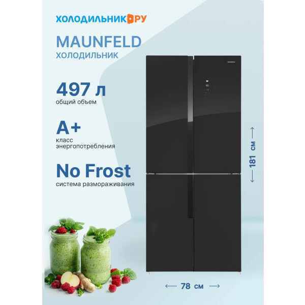 Холодильник Maunfeld MFF181NFB со стеклянным фасадом. Благодаря объему 474 л в нем можно хранить большой запас продуктов, а внутреннее антибактериальное покрытие и встроенный ионизатор воздуха способствуют тому, что они долго не портятся.