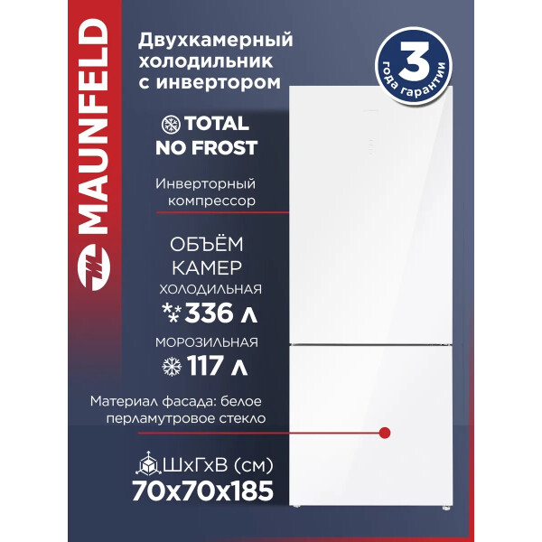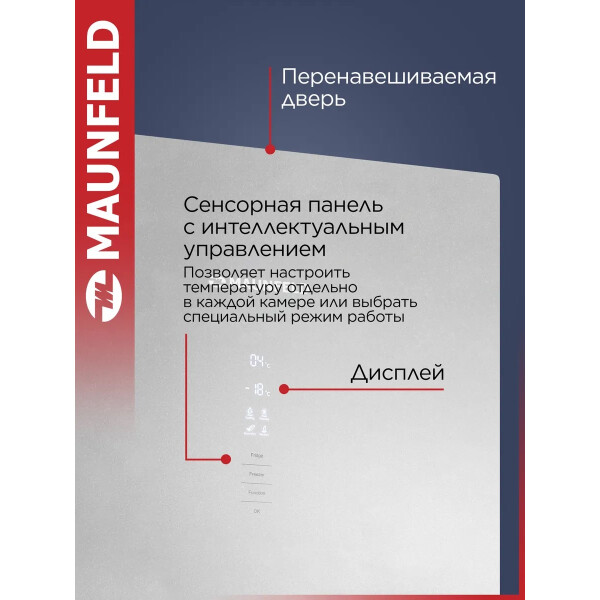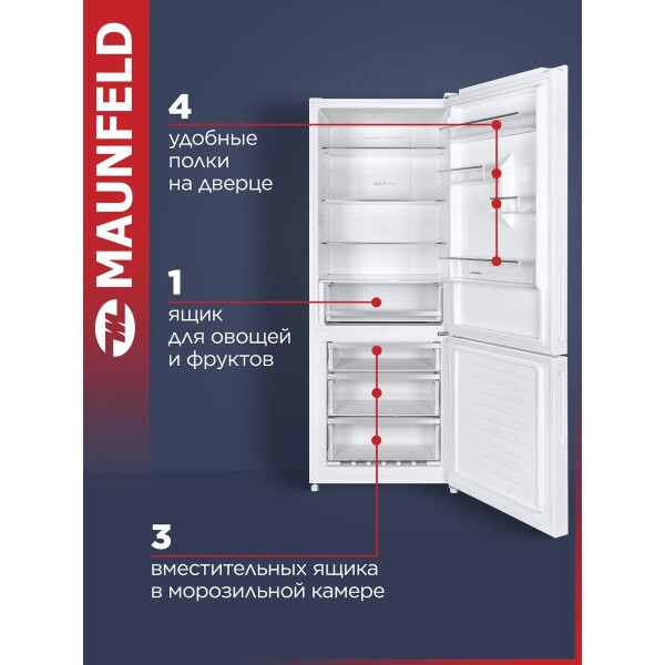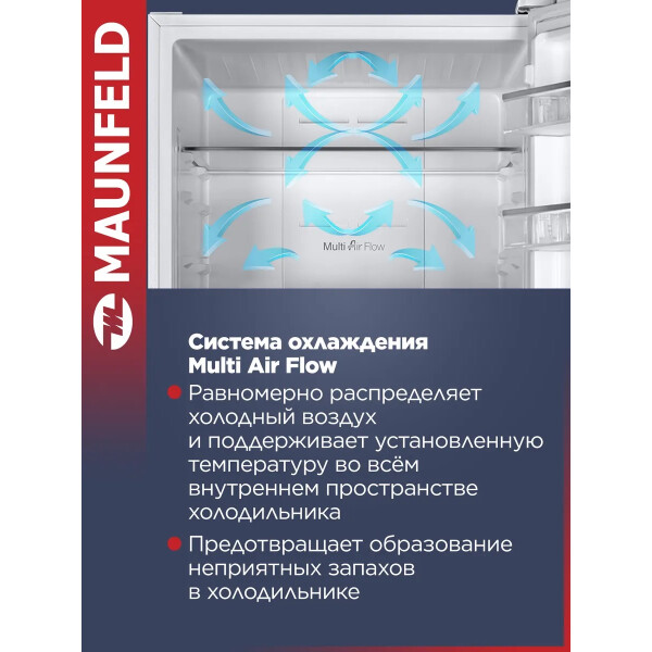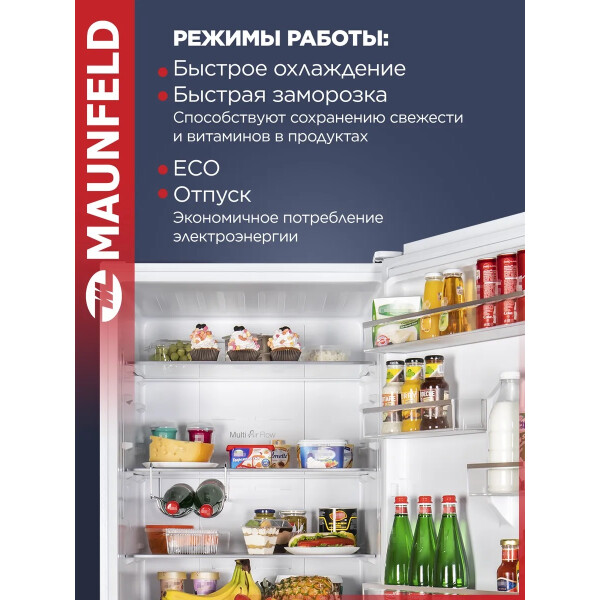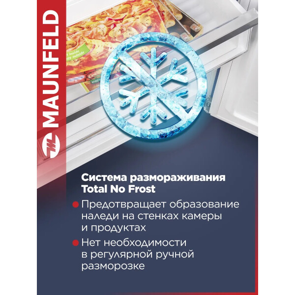 Больше нет необходимости размораживать холодильник, так как наледь не образуется в холодильниках MAUNFELD с системой автоматического оттаивания (NoFrost). Главные преимущества системы NoFrost в морозильной камере: замороженные продукты больше не склеиваются, не уменьшается внутреннее пространство из-за образования наледи, а ящики всегда так же легко и удобно открывать, как при первом использовании камеры.