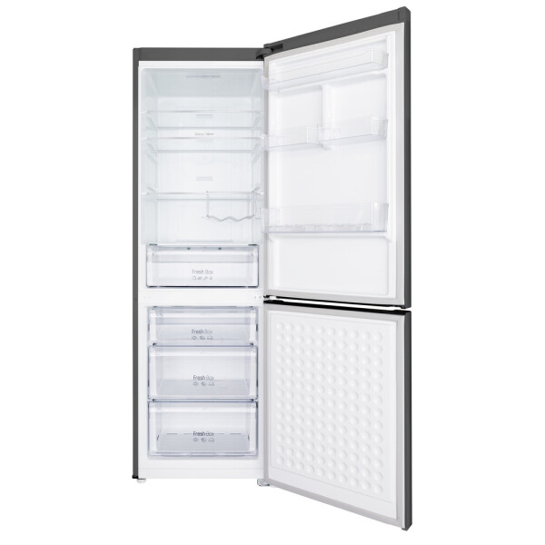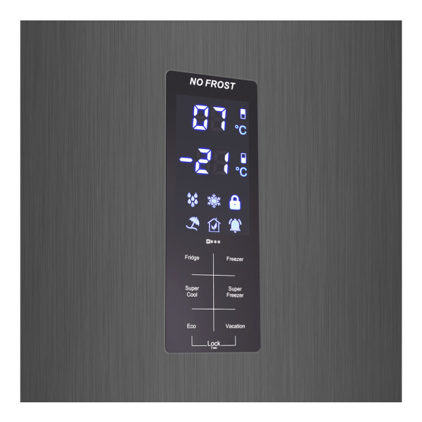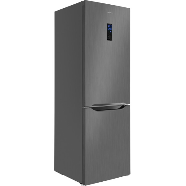 Современный двухкамерный холодильник с сенсорным управлением. Корпус шириной 60 см сделан из металла. Внутренняя часть выполнена из антибактериального белого пластика легкой очистки. Предусмотрена возможность перенавешивания двери.