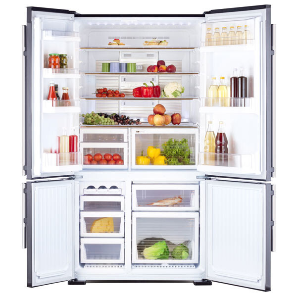 Четырехдверная модель устроена так, что холодильная камера располагается сверху, а морозильная — снизу.