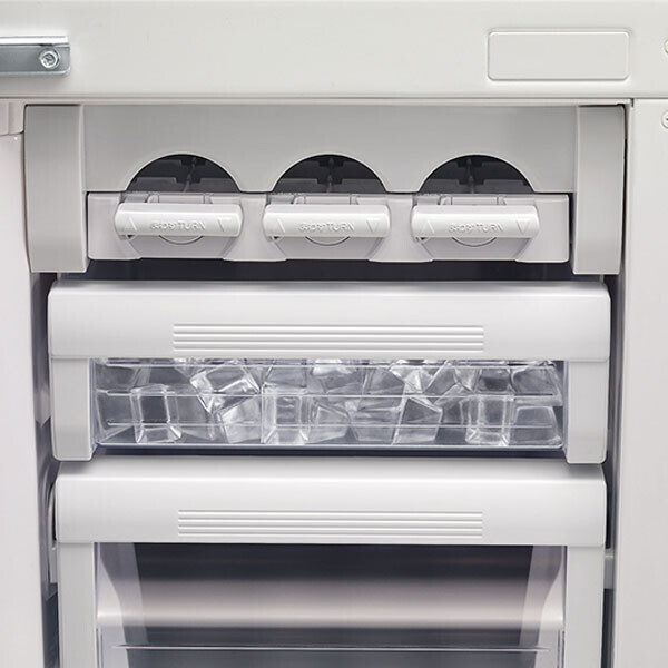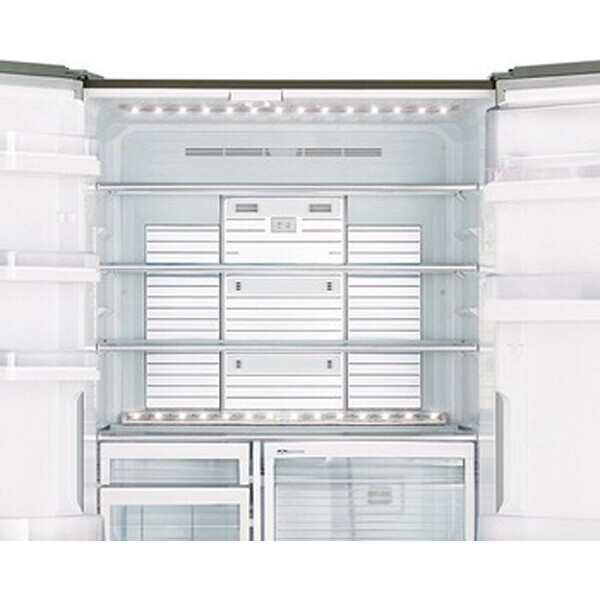 У этой модели нестандартная ширина, поэтому полезный объем больше, чем у схожих вариантов 550 литров. Холодильная камера располагается наверху, у нее четыре просторные полки. Три из них можно регулировать по высоте в зависимости от необходимости. Кроме того, в верхней части устройства расположена камера Витаминная фабрика. В этой зоне под особым светодиодным освещением, которое создает в отсеке эффект солнечных лучей, в овощах и фруктах вырабатывается витамин С. Таким образом, продукты, которые хранятся в этом отделении, дополнительно обогащаются полезными витаминами и минералами.