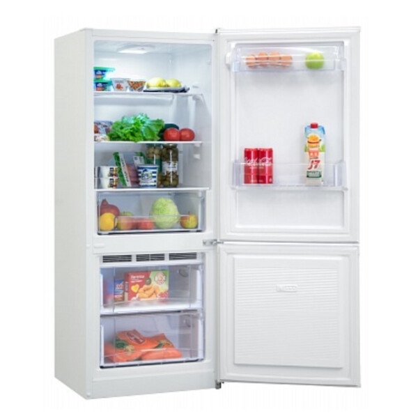 Двухкамерный холодильник с нижним расположением морозильной камеры высотой 150 см. Ламинированная внутренняя поверхность холодильника с антибактериальным покрытием. Экономичное LED освещение. Большой выдвижной ящик для овощей