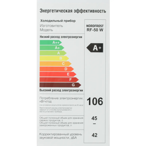 Однокамерный холодильник NORDFROST RF-50 W с низкотемпературным отделением и полезным объемом 43 компактный по своим размерам, поэтому подходит для помещений с минимальным свободным пространством.