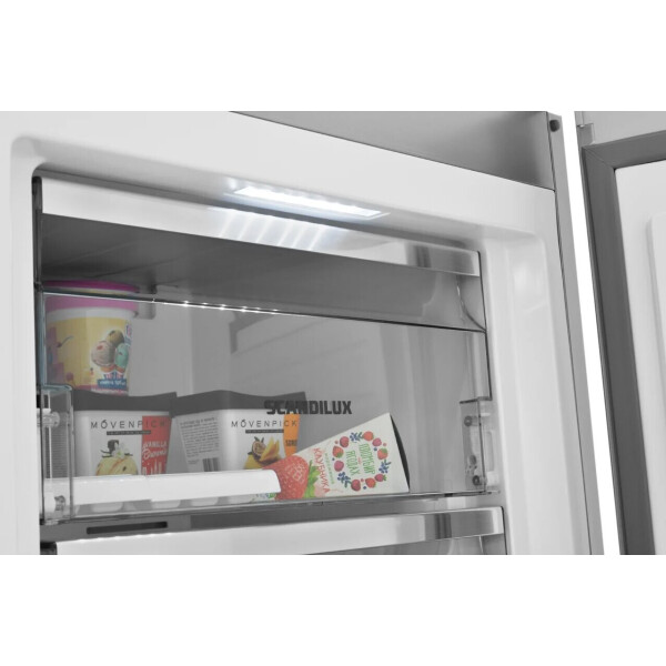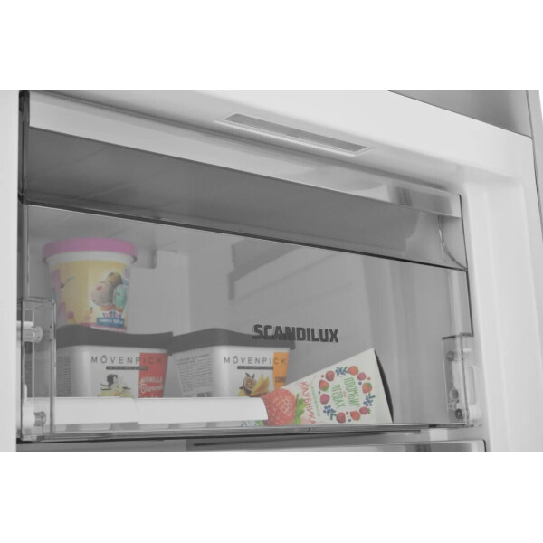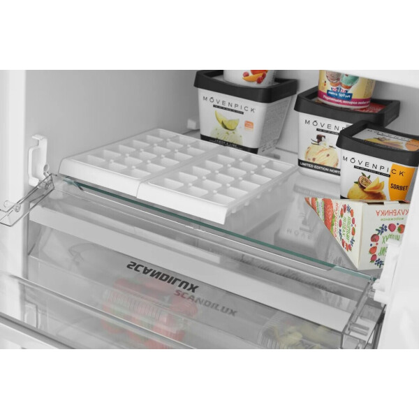 - Морозильная камера Scandilux дает уникальную возможность дополнительно увеличивать объем для еще более крупных продуктов: полки из закаленного стекла между секциями можно снимать. То есть, если вынуть ящик и полку под ним, то объем для крупногабаритного продукта сразу увеличится в 2 раза! Это позволит поставить посуду большого размера, целую тушку индейки или торт. Такую опцию предоставляют далеко не все бренды!
