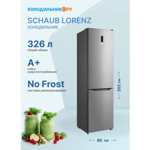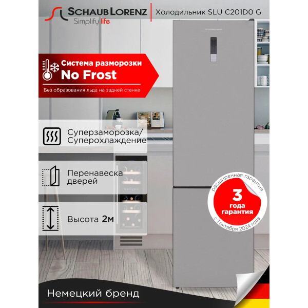 Двухкамерный отдельно стоящий с нижней морозильной камерой холодильник Schaub Lorenz SLU C201D0 G высотой 2.1 метра оснащён автоматической функцией размораживания NO FROST в обеих камерах, поэтому облегчается процесс его использования.
