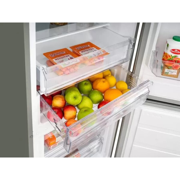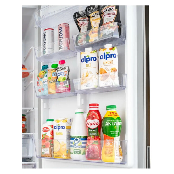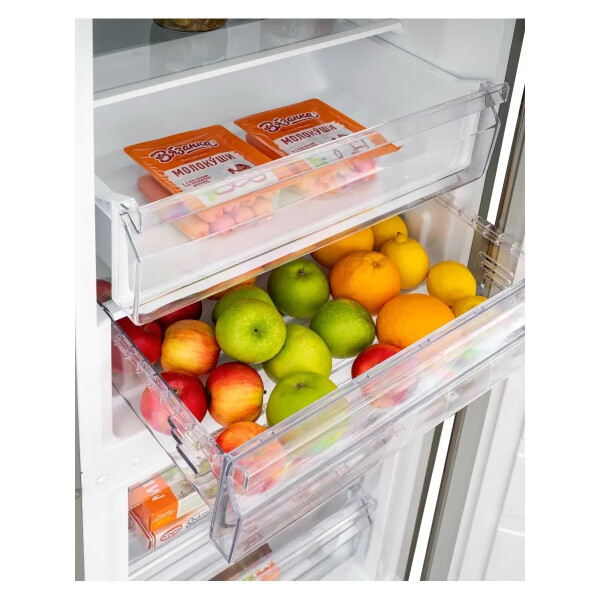 В холодильной камере располагаются 3 прочные полки из закаленного стекла и 2 пластиковые ящики для овощей и фруктов, также на дверце находятся 2 длинные и 4 небольшие полки.
