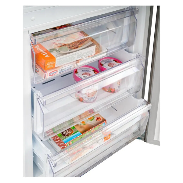 В морозильной камере расположены 3 прозрачных пластиковых ящика.