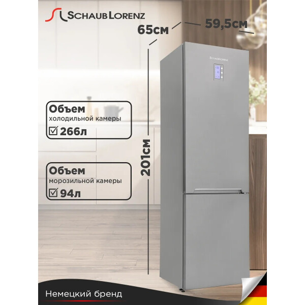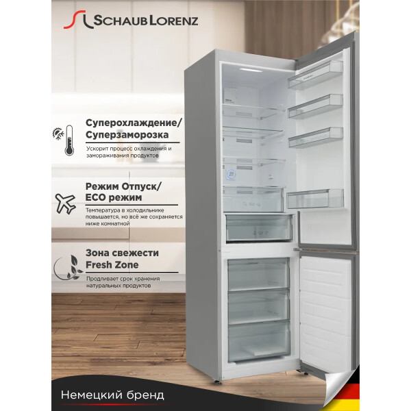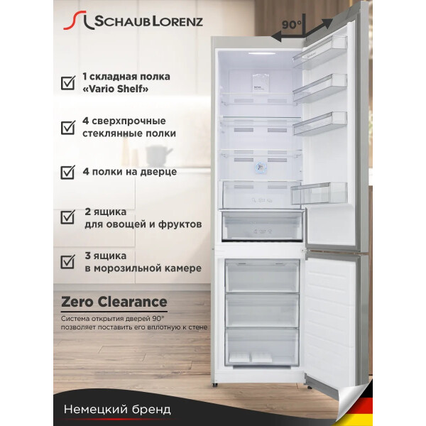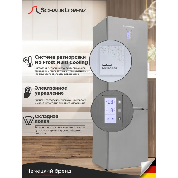 Schaub Lorenz SLU S379G4E – двухкамерная модель цвета нержавеющей стали с нижней морозильной камерой. Имеет низкий уровень энергопотребления. В морозильной камере имеются три вместительных прозрачных ящика. Модель наполнена четырьмя сверхпрочными стеклянными полками, двумя ящиками для овощей и фруктов и четырьмя полочками на дверце холодильника, а также креативной складной полочкой «Vario Shelf».