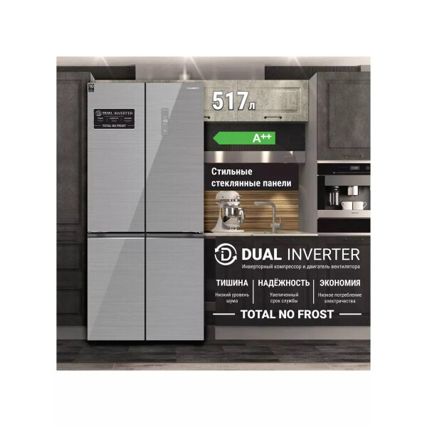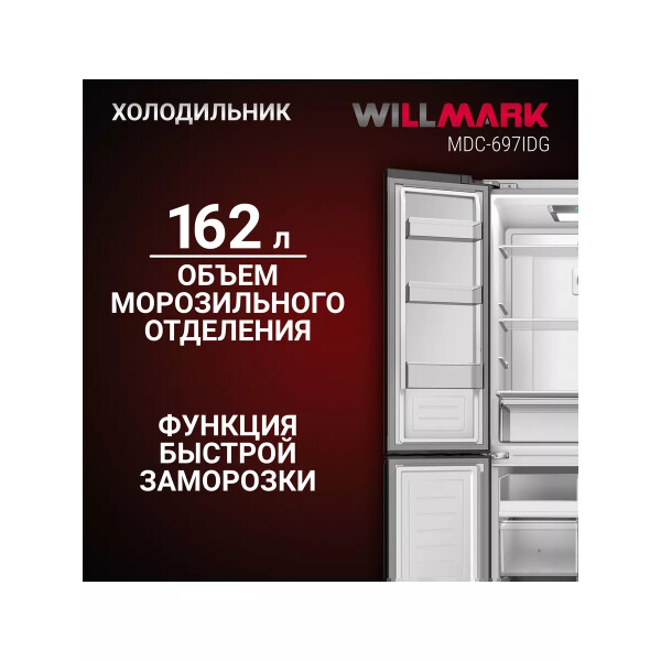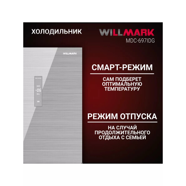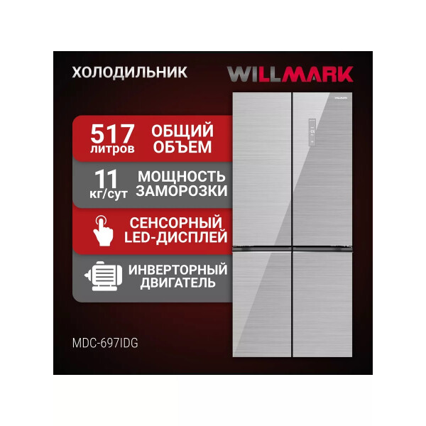 Холодильник Willmark MDC-697IDG незаменимый помощник на кухне с электронным управлением представлен в цвете Skygrey и является мощным холодильным агрегатом с общей вместимостью 517 литров. Технология DUAL INVERTER означает наличие в устройстве двух инверторных элементов: компрессора и вентилятора. Для хранения в нем продуктов предусмотрены 3 камеры с распашными дверями со стеклянными панелями. Модель совмещает в себе стильный дизайн, отличные технические характеристики и высокие эксплуатационные качества.