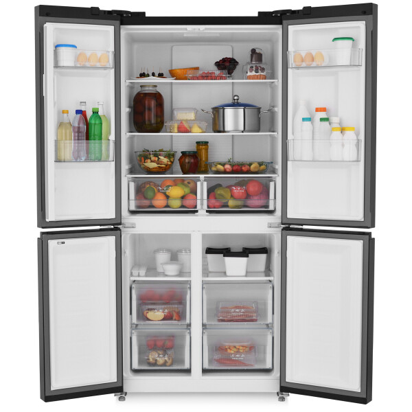 4-х дверный холодильник имеет общий объем 482 л, единое пространство верхних полок холодильной камеры, чтобы удобно было размещать габаритные кастрюли и контейнеры. Прочные полки из закаленного стекла можно регулировать по высоте, а ящики в холодильной камере предназначены для хранения овощей и фруктов.