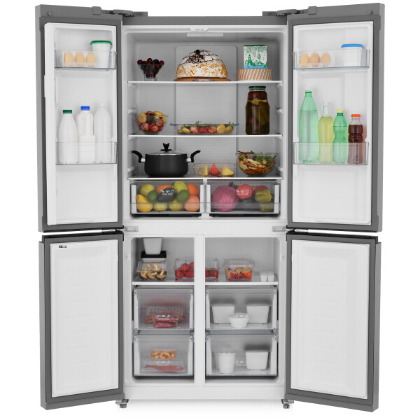 4-х дверный холодильник имеет общий объем 482 л, единое пространство верхних полок холодильной камеры, чтобы удобно было размещать габаритные кастрюли и контейнеры.