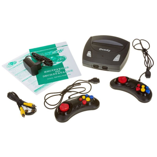 195 встроенных игр, в комплекте 2 проводных геймпада, адаптер питания, AV-кабель, поддержка оригинальных картриджей Dendy.