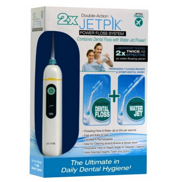 Jetpik JP50-Travel снабжен скребком для языка для тщательного удаления вредного налета, а также тремя флос-картриджами. Прибор работает от аккумулятора в течение 25 минут, эргономичная форма прибора и малый вес позволяет пользоваться им довольно долго без дискомфорта.