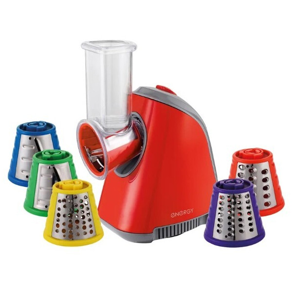 Электротерка Energy EN-146, представленная в ярком красном цвете корпуса и укомплектованная пятью разноцветными насадками для более удобной идентификации, возьмет на себя столь утомительное занятие, как шинковка и измельчение различных продуктов. Прибор, обладающий мощностью 250 Вт, также может использоваться для нарезки толстыми и тонкими ломтиками, что особенно актуально при подготовке овощной, мясной или сырной тарелки. Модель Energy EN-146 управляется механической кнопкой, располагающейся в верхней части корпуса.