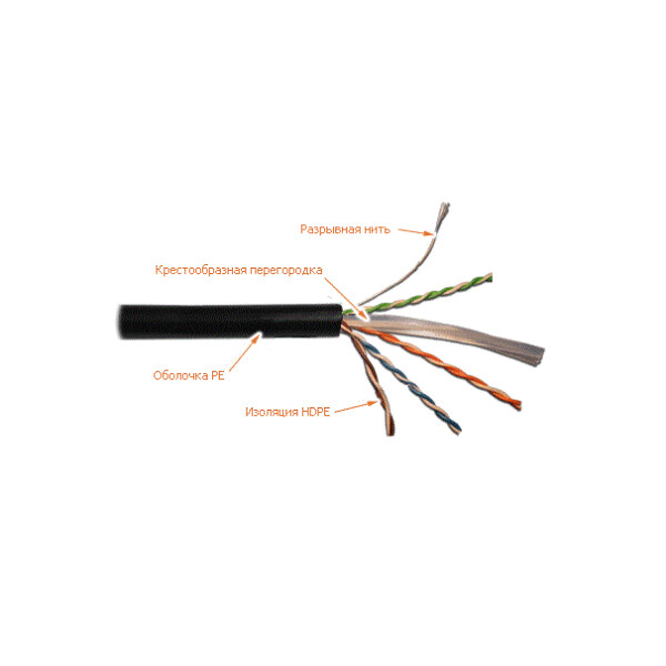 Кабель витая пара фирмы Lanmaster LAN-6EUTP-OUT состоит из 4-х пар одножильных медных проводников. Каждый проводник кабеля заключен в изоляцию HDPE. Два проводника, скрученных со специально подобранным шагом, составляют одну витую пару. Пары отделены друг от друга крестообразной перегородкой увеличивающей переходное затухание между парами. 4 витых пары и перегородка обернуты полиэтиленовой пленкой и заключены в оболочку из PЕ. Для облегчения разделки кабеля под оболочкой имеется разрывная нить. Частотный диапазон 1-550 МГц. Цветовая кодировка: пара 1 «голубой/бело-голубой»; пара 2 «оранжевый/бело-оранжевый»; пара 3 «зеленый/бело-зеленый»; пара 4 «коричневый/бело-коричневый».