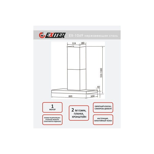 Каминная пристенная вытяжка. 1 мотор. Часы.