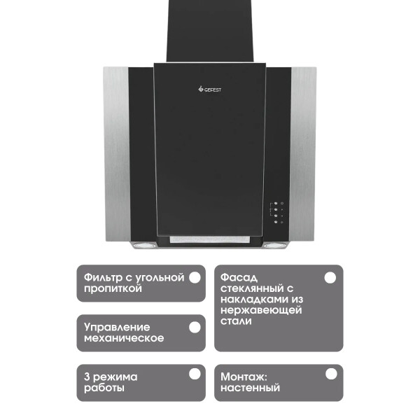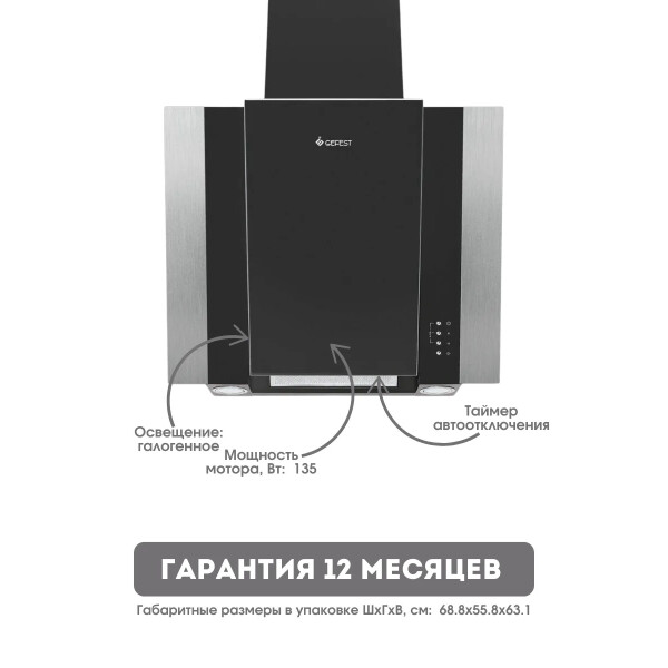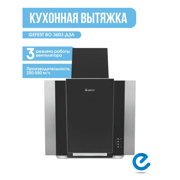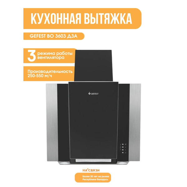 Вытяжка GEFEST ВО 3603 Д3А - воздухоочиститель электрический бытовой. Эффективно помогает снизить загрязнение стен, потолков и мебели жировыми частицами, сажей, копотью в процессе приготовления пищи. Он относится к приборам, работающим под надзором, и эксплуатируется в циркуляционном режиме (очищенный воздух возвращается в помещение кухни), дополнительно имеется возможность выводить очищенный воздух через трубу наружу. Минимальное расстояние между плоскостью установки посуды на плиту (нагревательной поверхностью) и воздухоочистителем должно быть 65 см. Воздухоочиститель крепится на ровную поверхность. Панель управления находится на передней поверхности короба. Управление производится прикосновением к сенсорной зоне на стекле в соответствии с обозначенным символом необходимой функции. Таймер включается нажатием и удержанием (приблизительно 5 секунд) кнопки режима работы вентилятора.