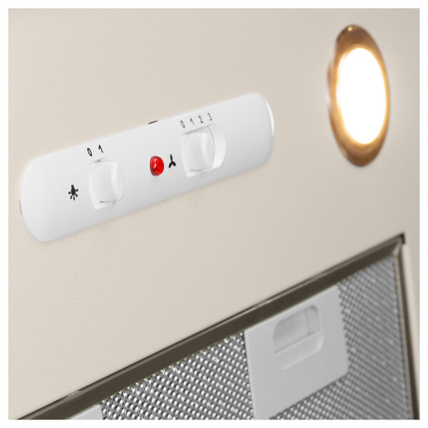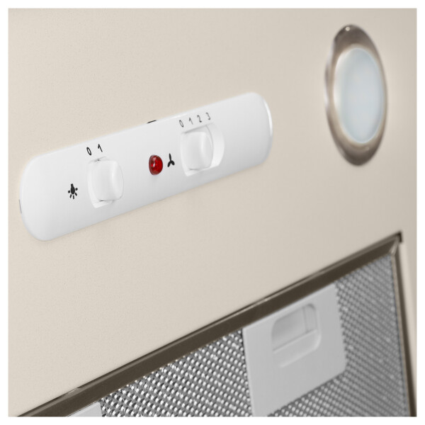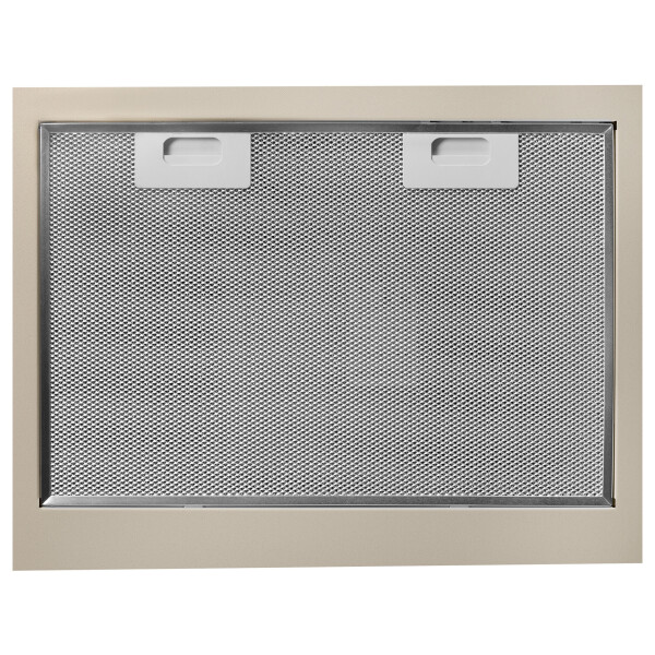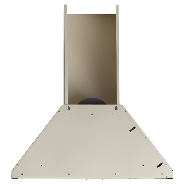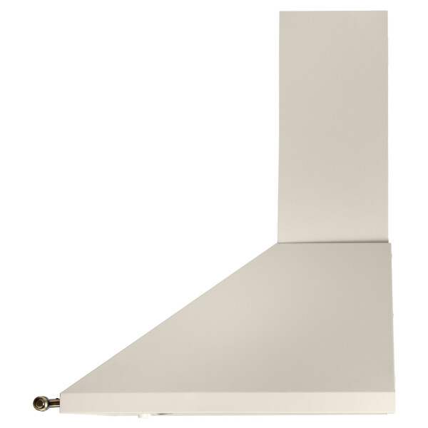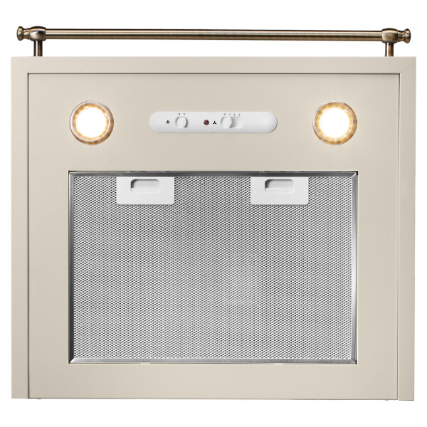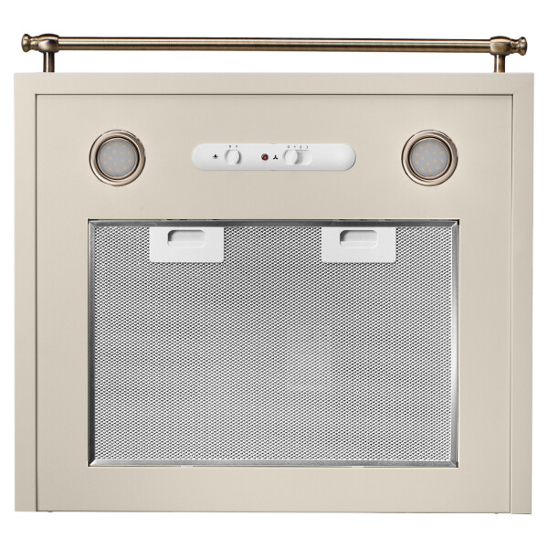 Эта классическая каминная вытяжка выполнена в бежевом цветовом исполнении с горизонтальным ограничительным карнизом, окрашенным под бронзу.