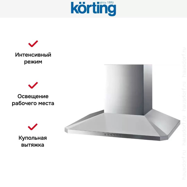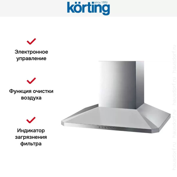 Вытяжка Korting KHC 6951 X современная модель с мощной турбиной и четырьмя режимами: три скорости и интенсивная программа Booster. Функция Clean Air используется для периодического проветривания: прибор включается на 10 минут в течение каждого часа.