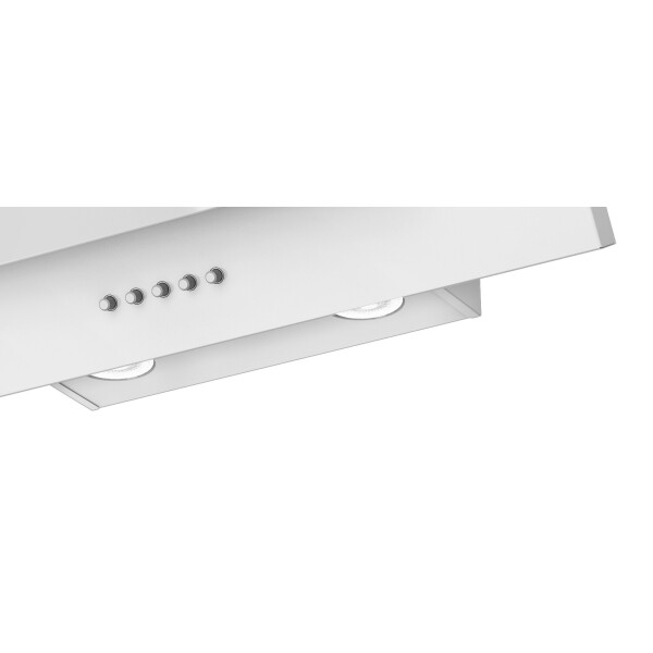 Изящная, элегантная, и при этом мощная наклонная вытяжка от Weissgauff, выполненная в белом цвете, сочетает в своём дизайне металл и стекло, что делает её более универсальной при использовании в интерьере кухни
