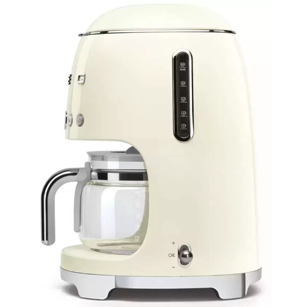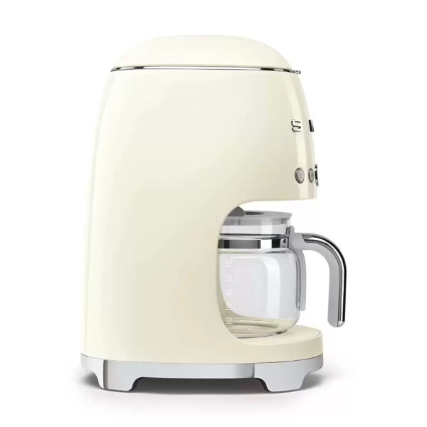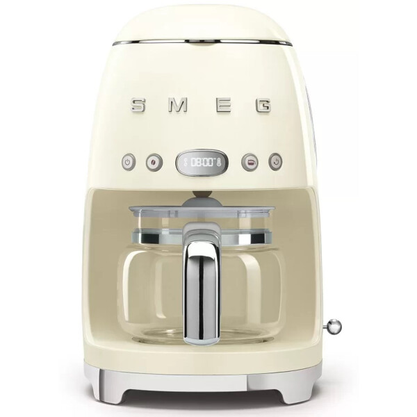 Капельная кофеварка Smeg кремового цвета, с объёмом в 10 чашек, имеет цифровые часы - LED-дисплей и удобную панель управления.