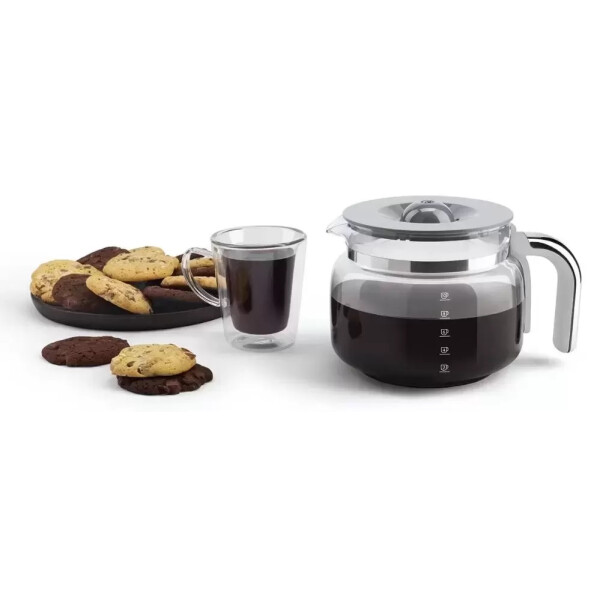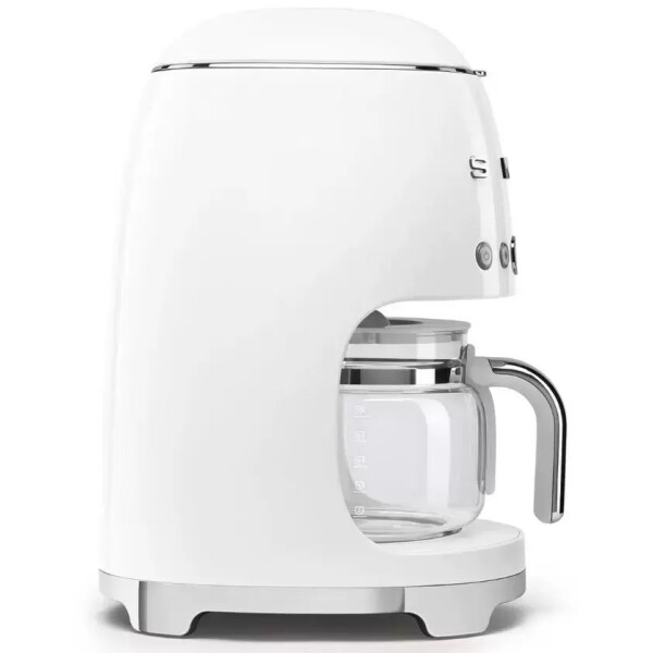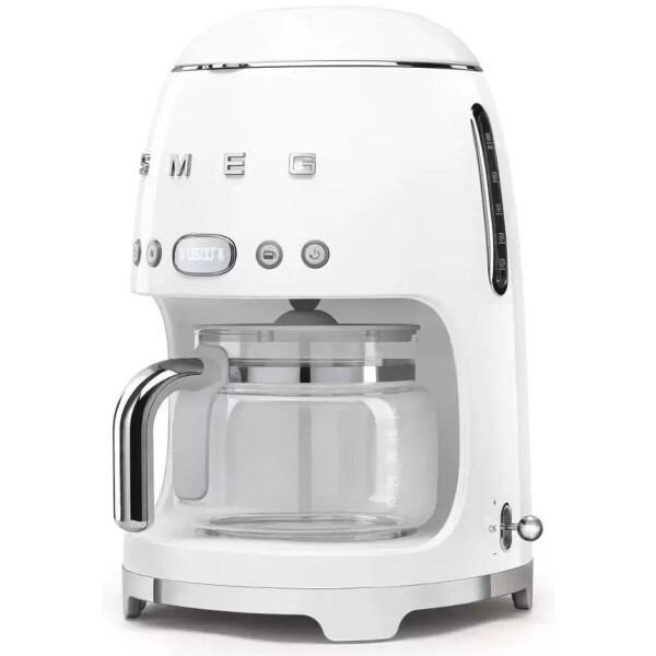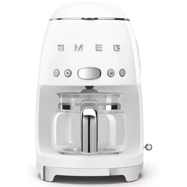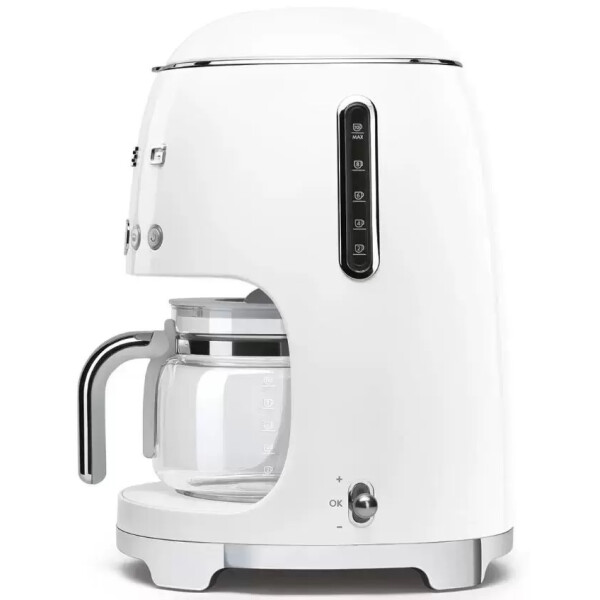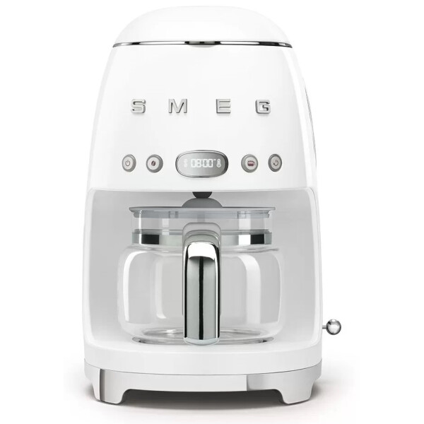Капельная кофеварка Smeg DCF02WHEU белого цвета, с объёмом в 10 чашек, имеет цифровые часы - LED-дисплей и удобную панель управления.