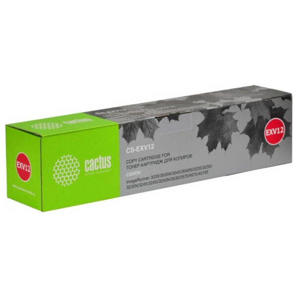 Лазерный картридж Cactus CS-EXV12 (С-EXV12). Он совместим с лазерными принтерами Canon ImageRunner 3035, 3035N, 3045, 3045N, 3235, 3235i, 3235N, 3245, 3245i, 3245N, 3530, 3570, 4570, 4570F. Цвет - черный. С помощью данного картриджа Вы сможете распечатать порядка 24000 страниц текста (при 5% заполнении листа). Cactus CS-EXV12 создан по аналогии скартриджем Canon EXV12 (С-EXV12), нисколько не уступает ему по качеству печати, но цена его значительно ниже.