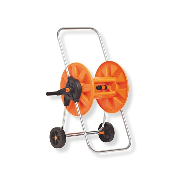 Очень прочная катушка для шланга в стальной раме и с барабаном из ударопрочного полипропилена Предназначена для намотки 100 м шланга 1/2" Поставляется в комплекте с переходниками для шлангов