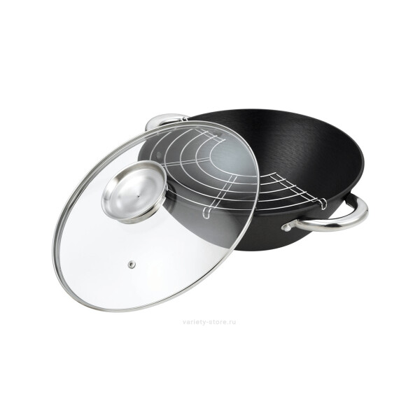 Казан Bekker BK-618 26 см (объем 3.1л, крышка стеклянная с воронкой-дозатором, ручки из нержавеющей стали, хром. решетка для гриля, антипригарное покрытие, подходит для индукционных плит, не подходит для посудомоечных машин, состав: чугун)